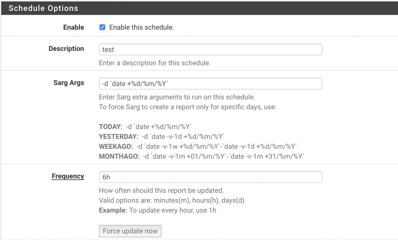 转到状态 > Sarg Reports菜单。在下图中,你可以根据需要进行设置,然后保存