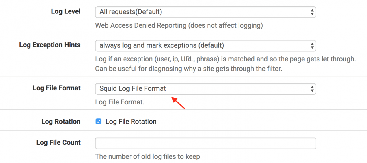 转到系统服务 E2guardian菜单,在日志设置下,找到日志文件格式并将其更改为Squid日志文件格式,然后保存设置。