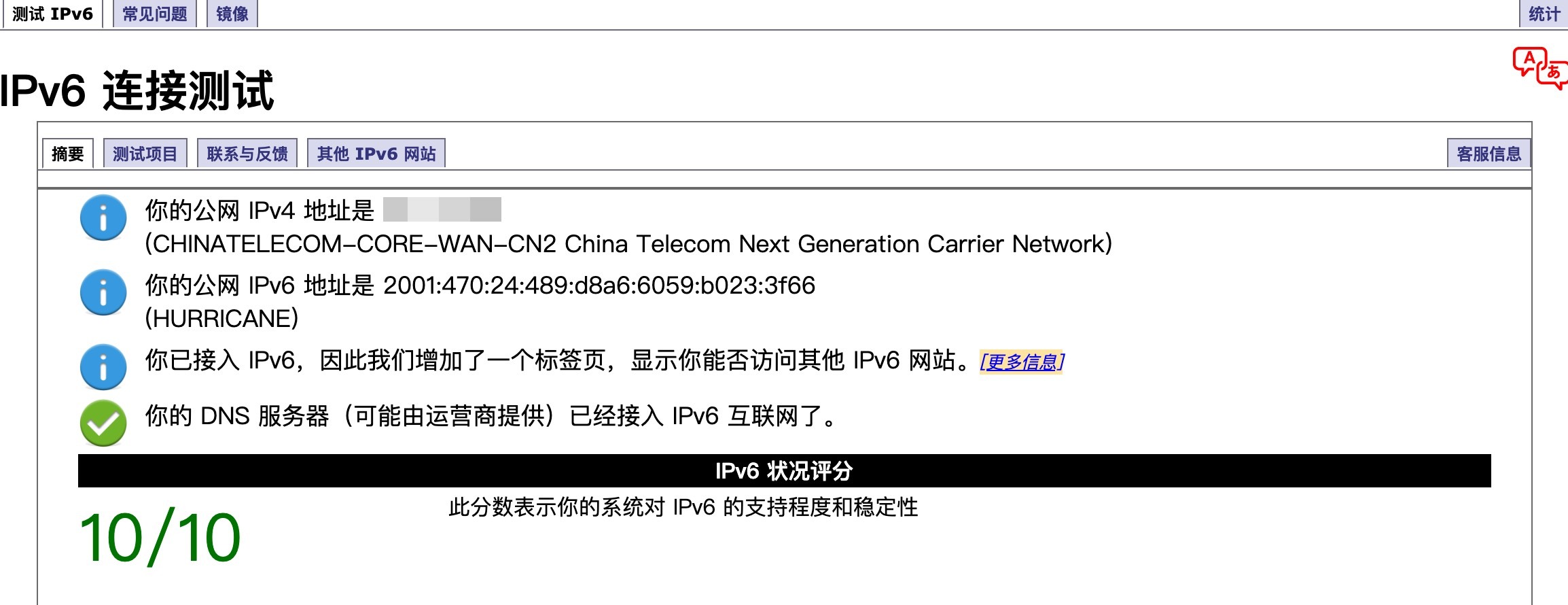 完成以上设置后,IPv6隧道就搭建完成了。防火墙后面的客户端IP地址设置为DHCP获取,访问test-ipv6.com,测试IPv6连接是否正常。