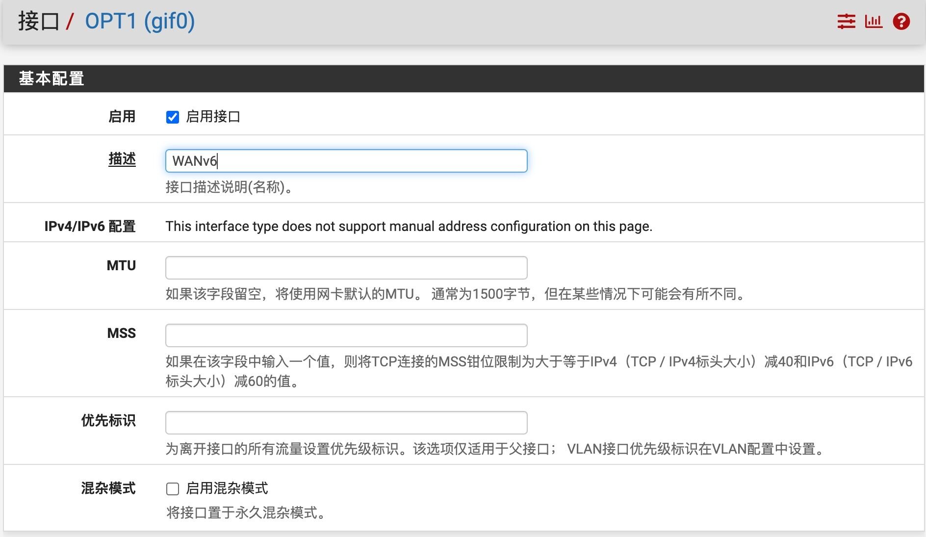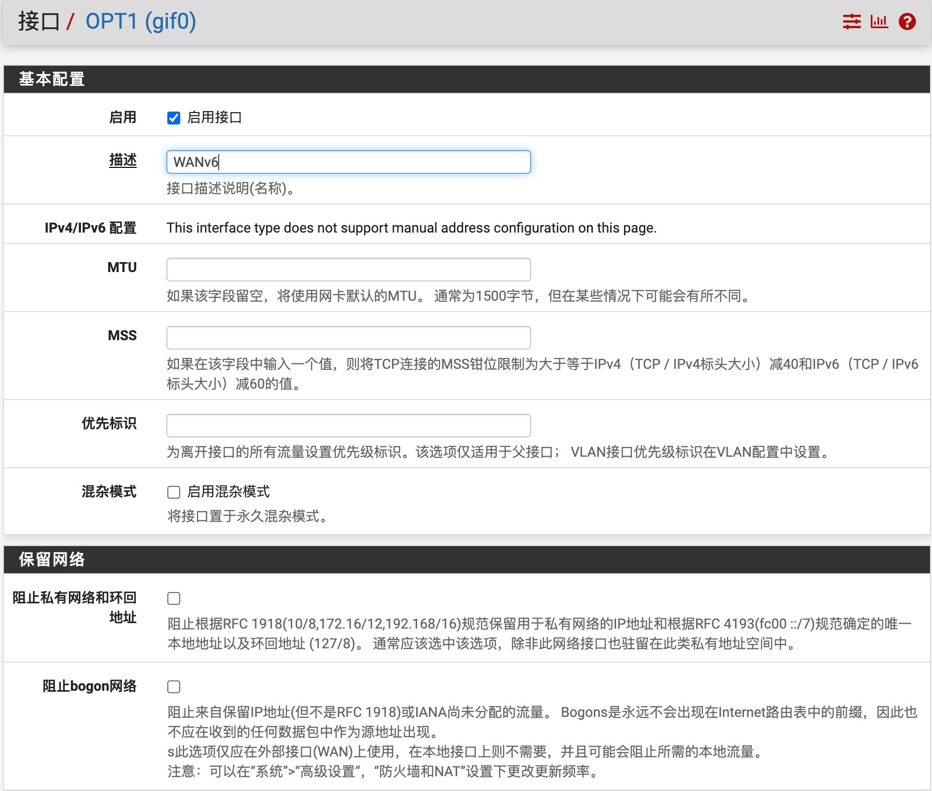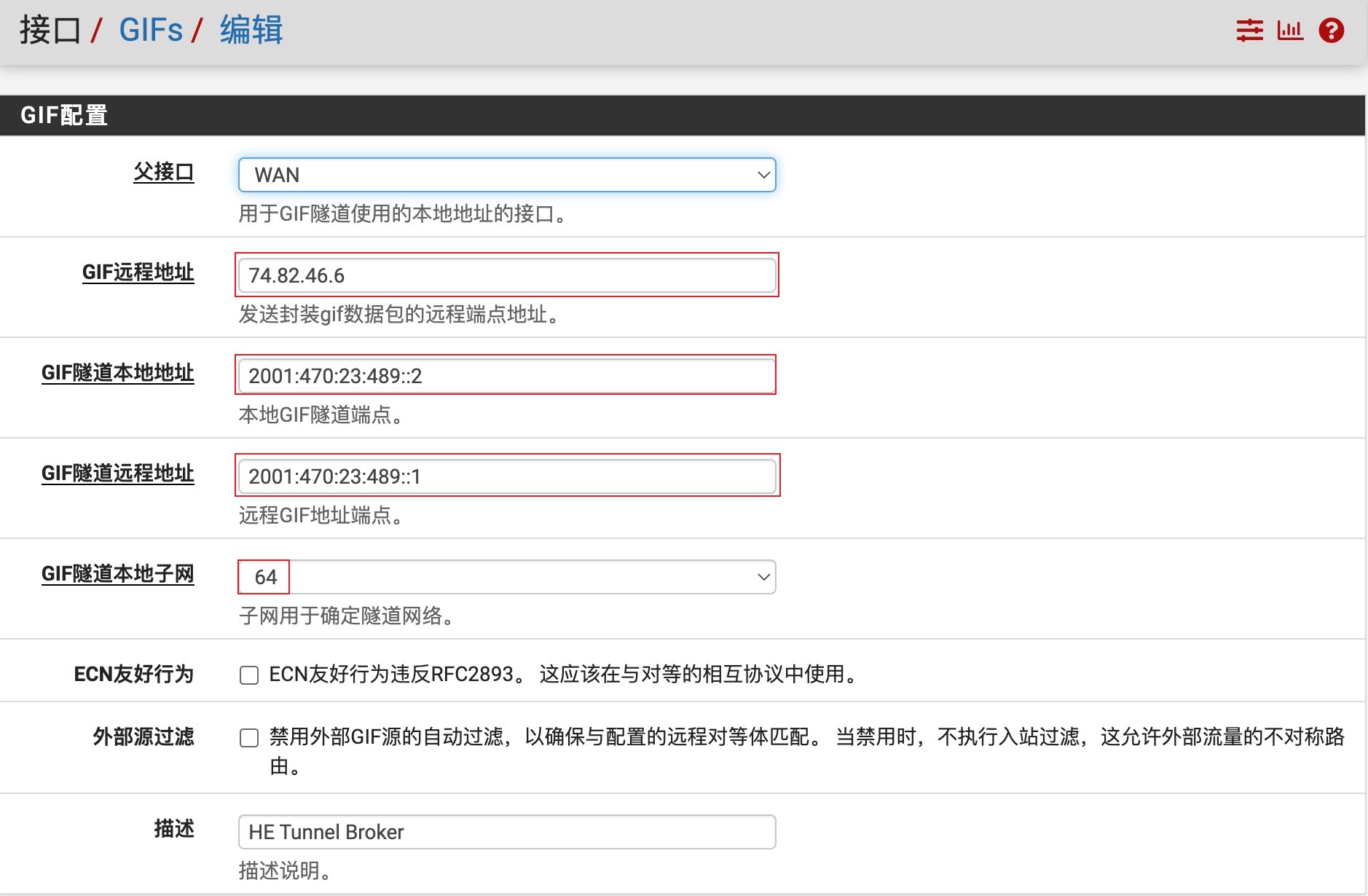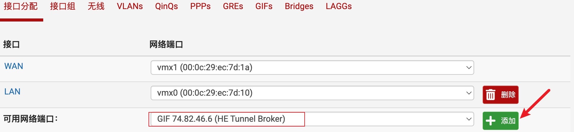 登录pfSense,导航到接口>分配,GIF选项卡,单击添加,创建一个GIF隧道,根据上面HE隧道显示的内容,填入GIF隧道相关信息。