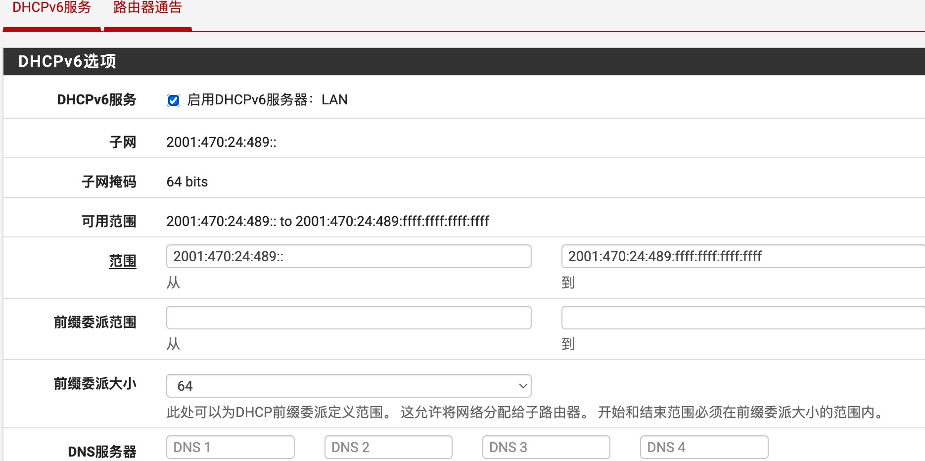 为了保证客户端口能正常获取IPv6地址,需要开启DHCPv6服务。 转到服务>DHCPv6 服务,选中启用,输入范围信息,选中前缀委派大小,然后单击保存。