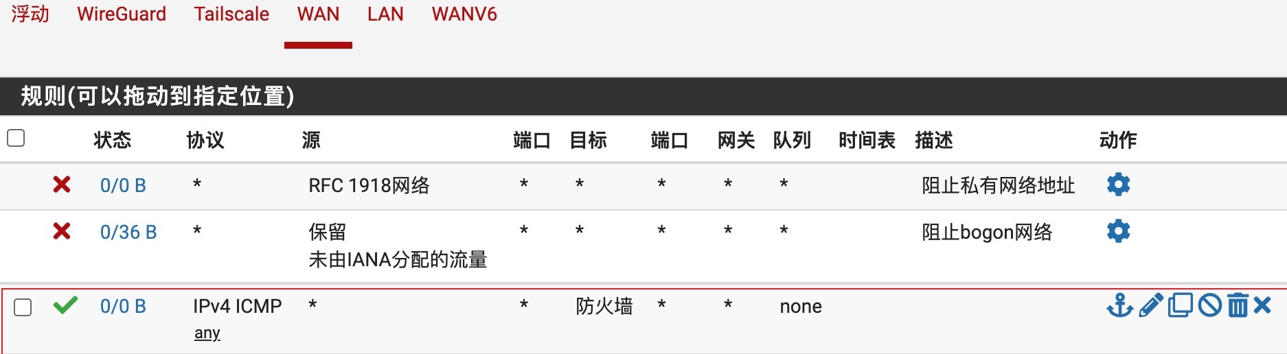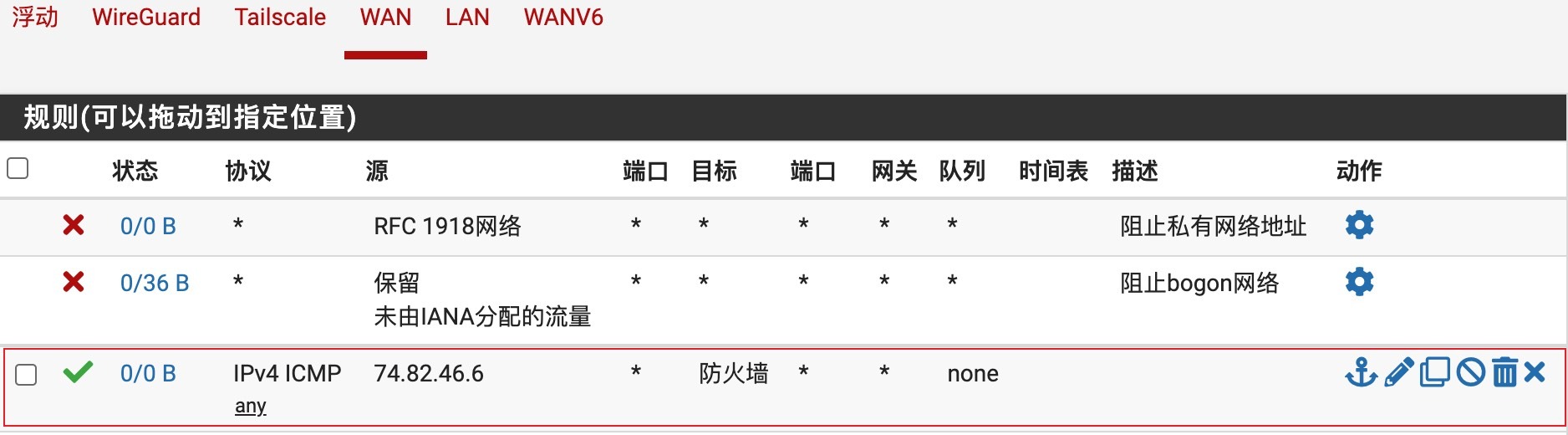 如果WAN地址无法ping通,则HE隧道无法建立。导航到防火墙>规则策略,WAN选项卡上,添加一条允许来自HE的ping规则,这里的源可以先设置为any。
