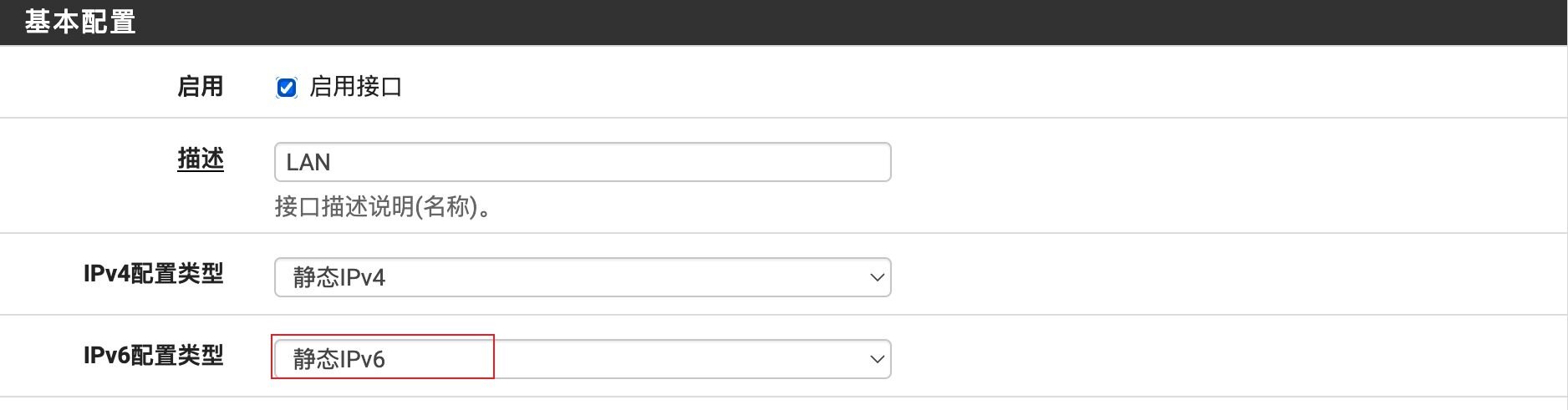 导航至接口>LAN,将IPv6 配置类型修改为静态IPv6。