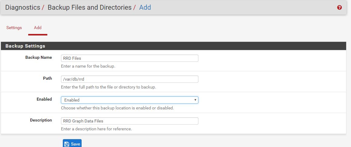 Backup插件可以对pfSense上的指定文件/文件夹进行备份和恢复。对于大多数情况而言,这不是必要的,但通过它我们可以备份RRD数据或未在config.xml中保留的自定义文件的程序包。