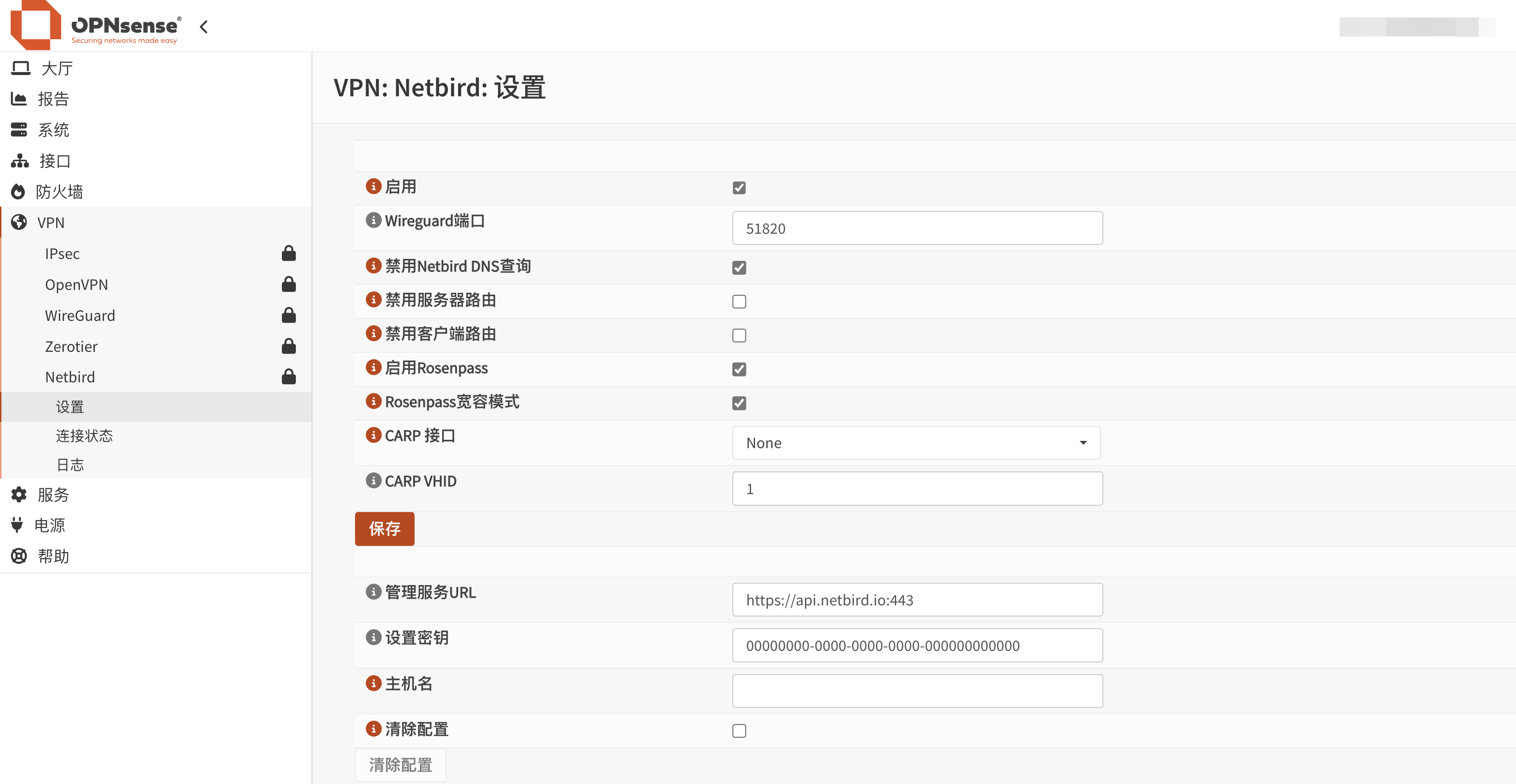 重启防火墙,导航到VPN>NetBird菜单,这里可以对NetBird进行一些简单的设置。
