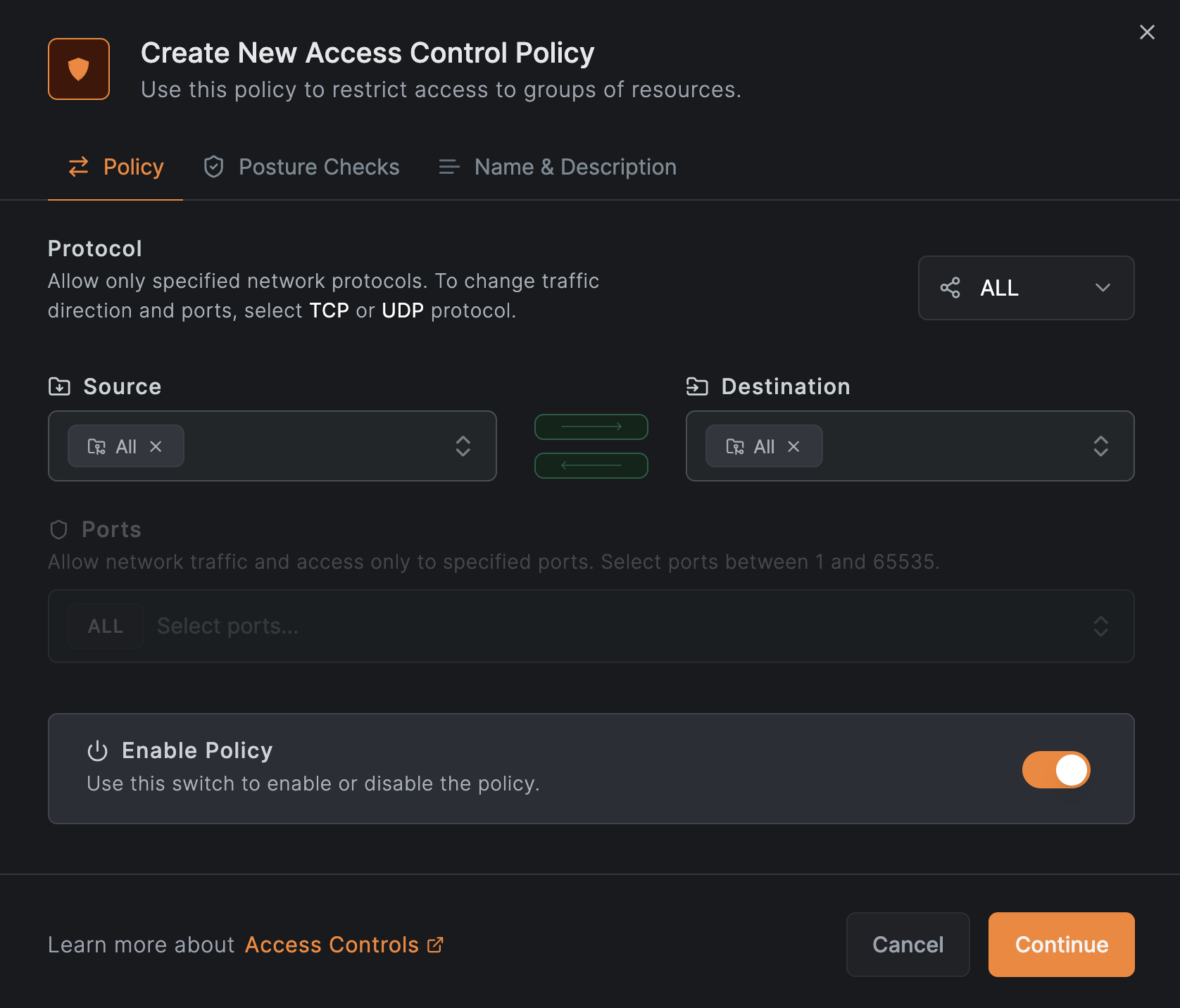 单击添加按钮,源和目标都选All,选中启用策略,单击继续。