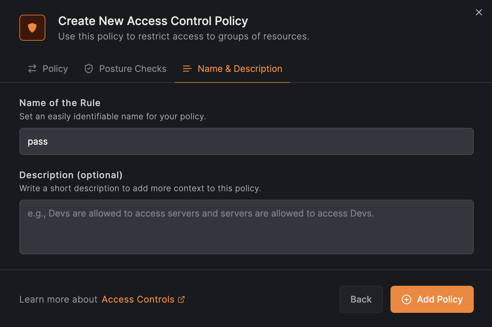 给策略输入一个名称和简单的描述信息,然后单击添加策略按钮。