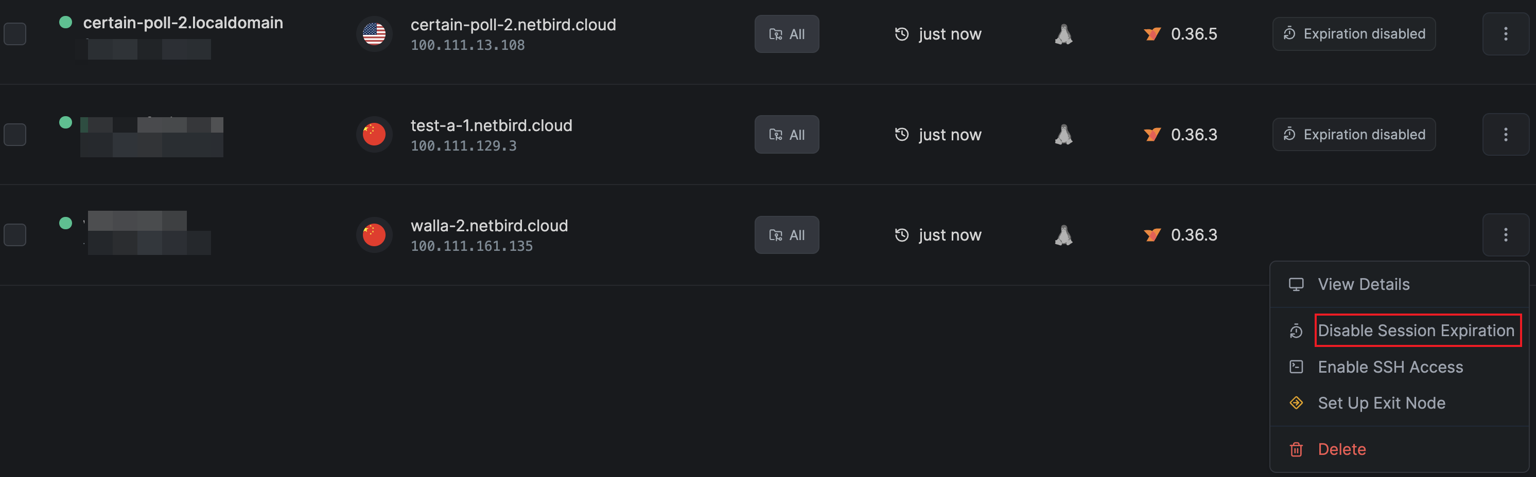 在NetBird控制台,点击通过认证设备节点最右侧选项,单击禁用会话过期,让节点始终保持在线。
