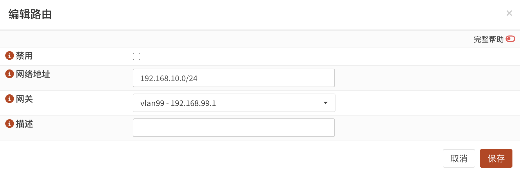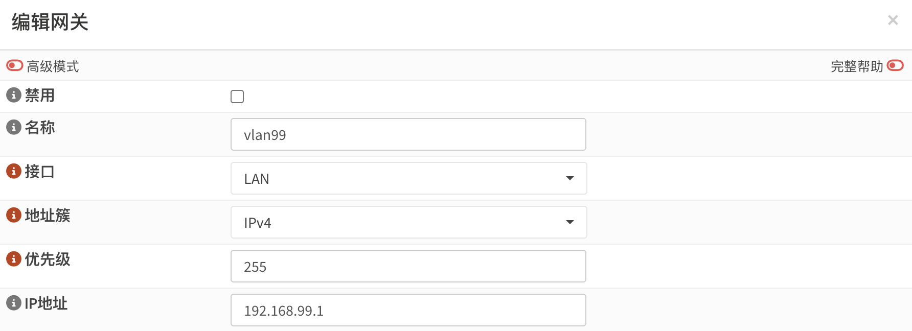 转到系统>网关>配置,在lan接口上添加一个网关,地址为交换机下联口地址192.168.99.1。
