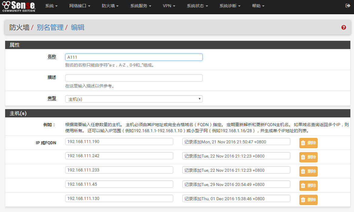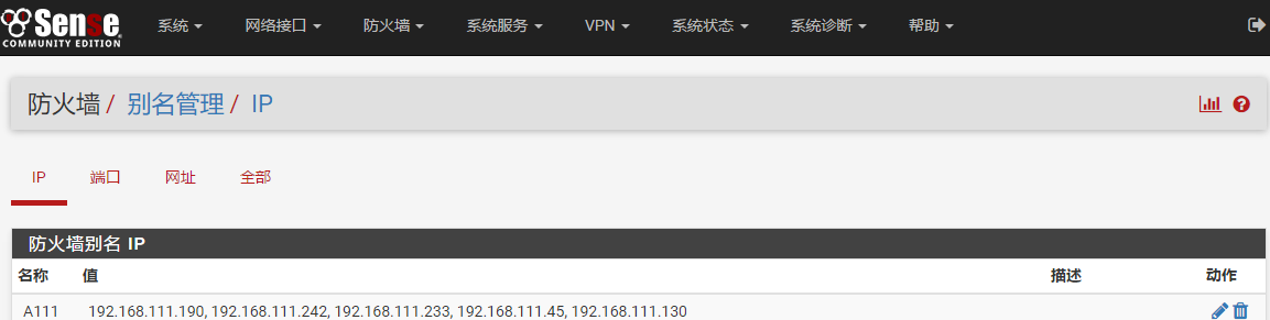 如果要对不同的IP、不同的网络限速,必须设置IP别名来管理。进入防火墙-别名管理,添加别名。别名可以是IP,也可以是网络或端口。