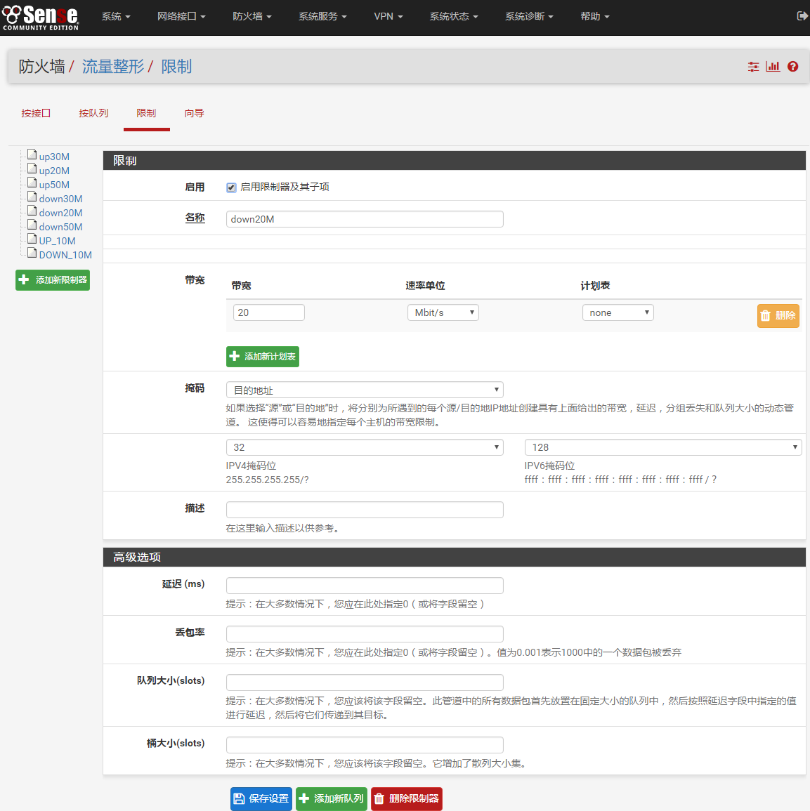 进入防火墙-流量整形-限制器,添加新限制器。在本示例中,下载、上传分别限制为20Mit/s。因为限速一般在LAN上设置,所以下载的限制器的掩码是目的地址,上传限制器掩码是源地址。