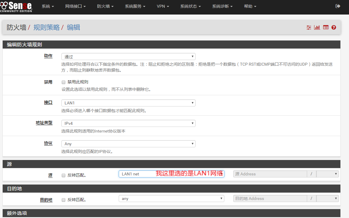 所有的流量管控,只能在防火墙上实现。进入防火墙-规则策略,在LAN1标签上,添加新规则。要注意三个部分,一个是接口,一个是源,还有一个是进/出管道设置。