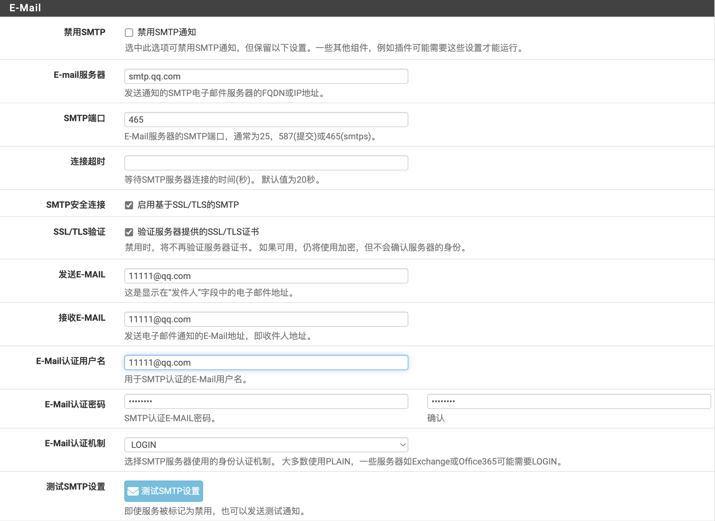设置完成,单击保存,然后点击测试SMTP设置按钮,检查QQ邮箱是否收到测试邮件。