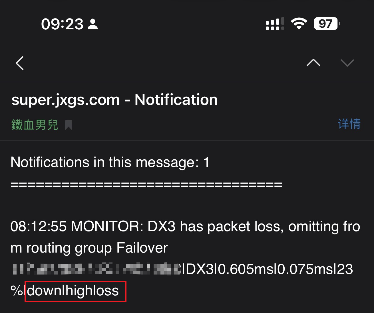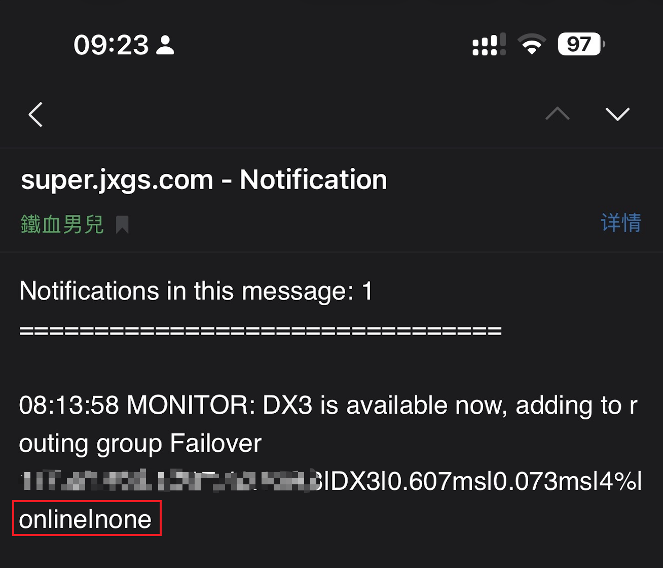 插上网线,稍等就收到另一封邮件,提示网关恢复了。