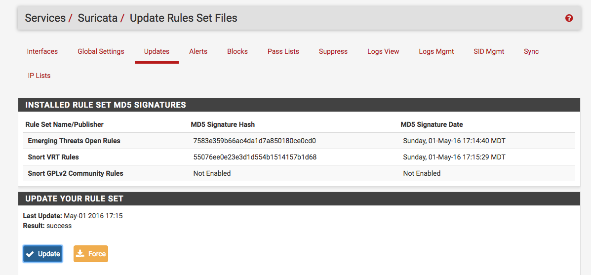 添加规则后,可以在Services -> Suricata -> Updates下手动更新下载规则: