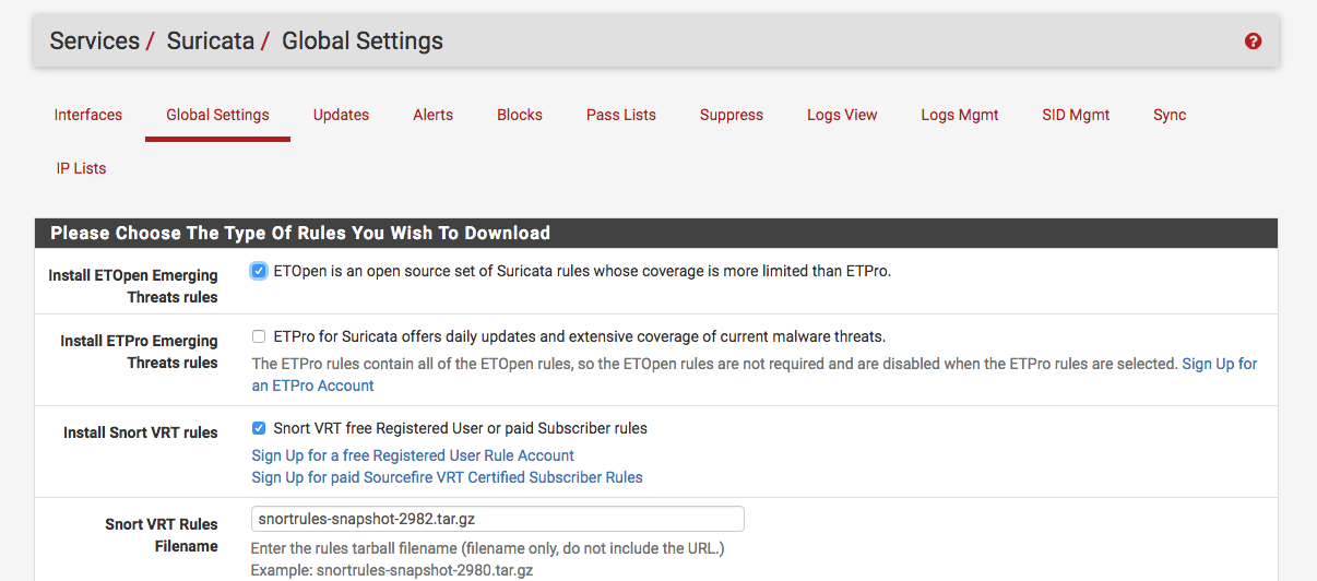 在Services -> Suricata -> Global Settings(全局设置)下,进行设置来下载Snort和ET规则: