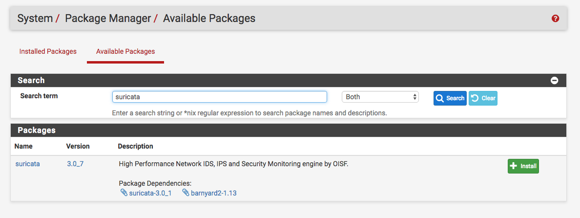 进入System -> Package Manager -> Available Packages,搜索suricata: