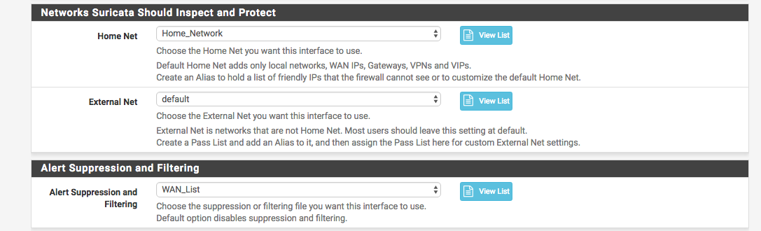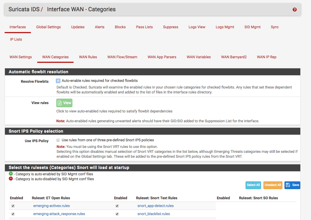 在抑制列表的顶部,还可以选择在Services -> Suricata -> Interfaces -> WAN Categories下启用哪些规则类别: