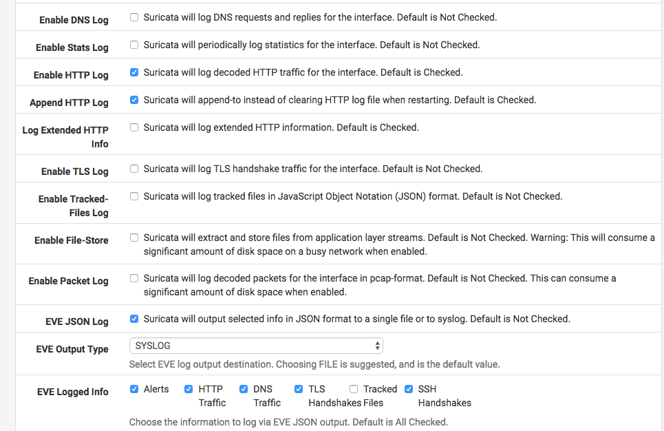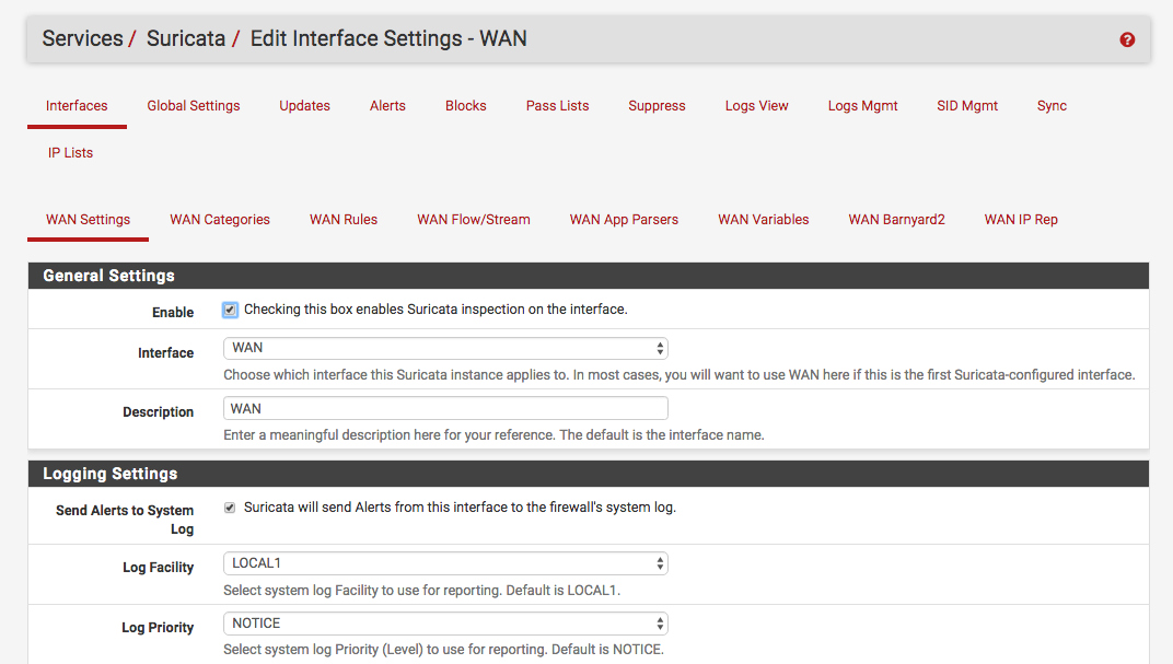 在Servces -> Suricata -> Interface -> WAN settings下,在Interfaces(接口)的General Settings(常规设置)下,我们启用它并设置日志记录: