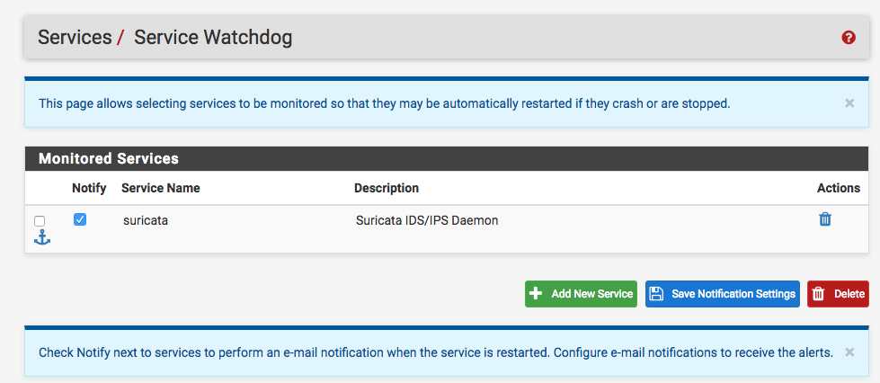 在Services -> Service Watchdog下,可以监控Suricata服务: