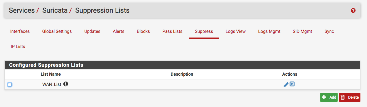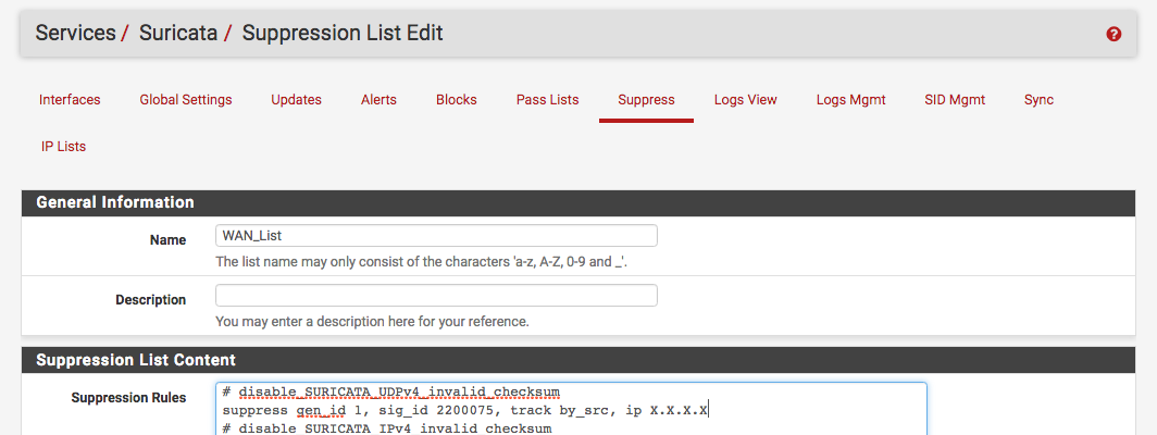 在Services-> Suricata -> Suppress下创建一个抑制列表来抑制某些snort和ET签名: