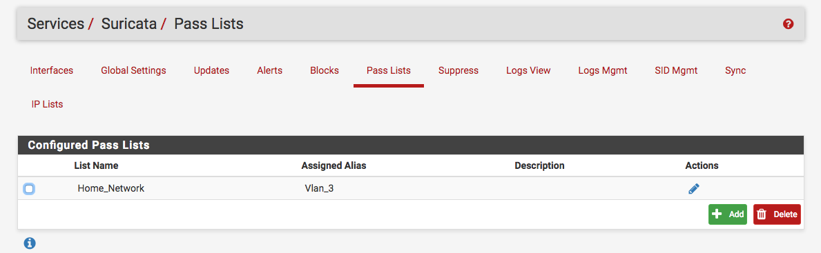 在Services -> Suricata -> Pass List下创建了一个代表home network(家庭网络)的列表: