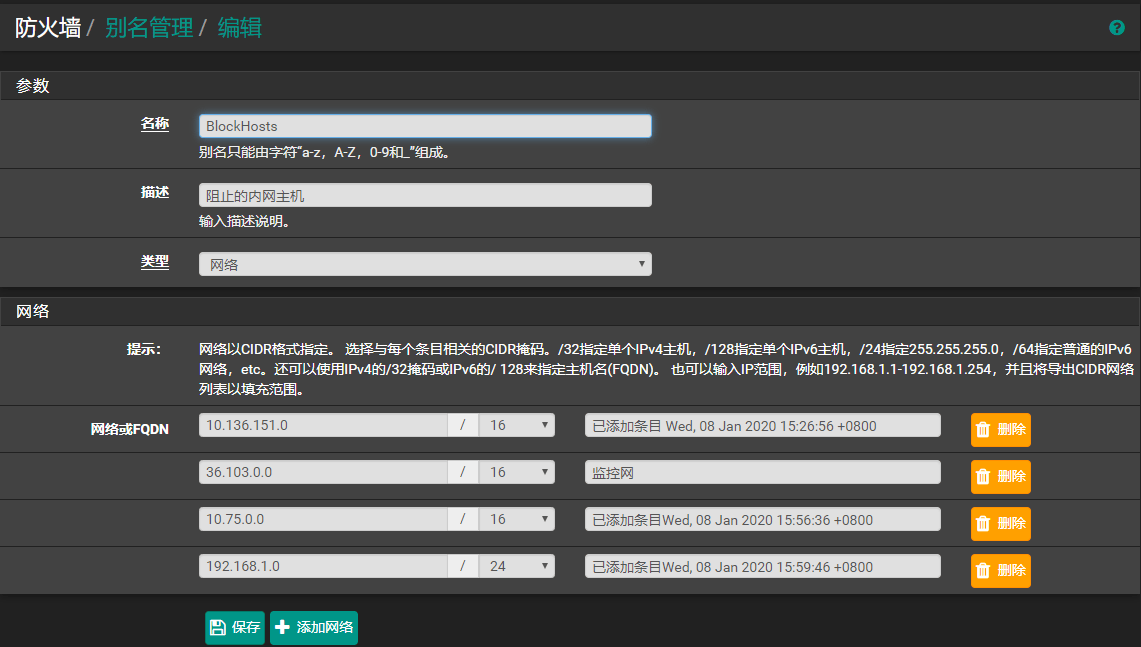 导航到防火墙>别名管理,添加一条新别名,将要阻止的网络添加到别名中。
