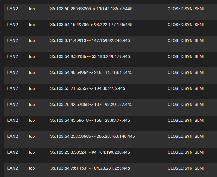 经了解,公司最近进行了监控设备改造,为方便查看,将监控视频接入了办公网络使用的交换机。通过查看状态表可以发现,以36.103开头的IP地址产生了很多的对外连接,该IP段为监控设备所使用的IP段。