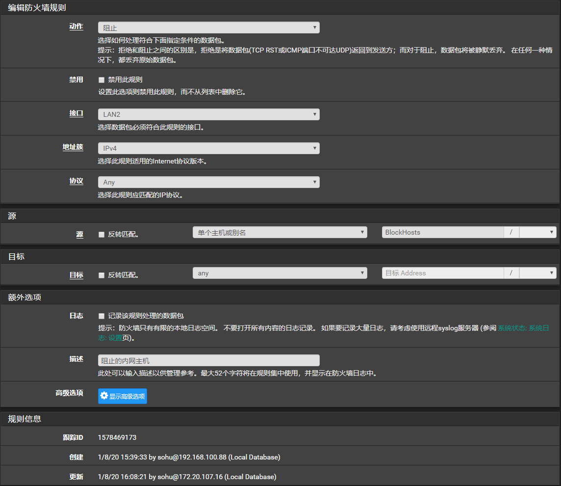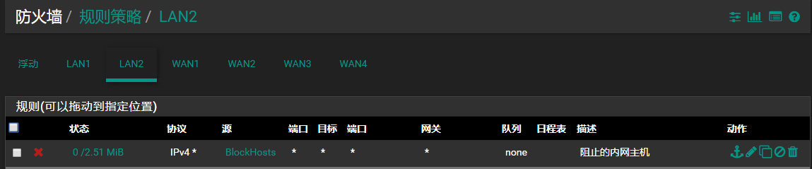 导航到防火墙>规则策略,在LAN2接口上添加一条阻止规则。注意源地址选前面建立的别名,规则设置如下: