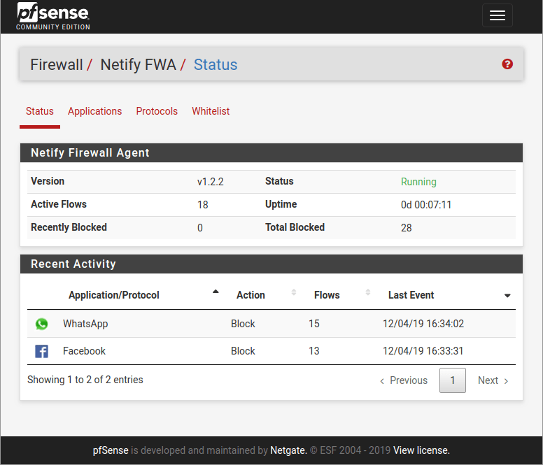 安装完成后,导航至状态> 服务,确保netifyd和netify-fwa服务正在运行。导航至防火墙>Netify FWA,在这里可以单击不同的选项卡来配置应用程序阻止规则、协议阻止规则和白名单。