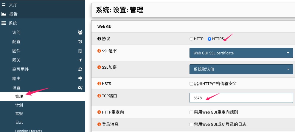 导航到系统>管理,修改https的访问端口,修改为5678,你也可以修改为你想要的其他端口。推荐采用https协议远程访问。