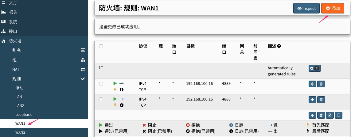 导航到防火墙>规则>WAN,本示例因为是多WAN,这里选WAN1。点击右侧的添加。