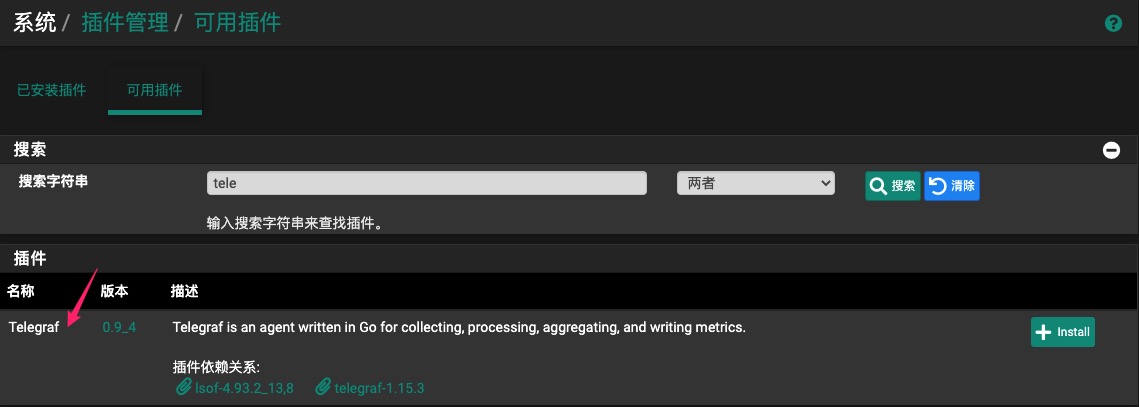 导航到pfSense防火墙的”系统- >插件管理=>可用插件”菜单,找到Telegraf插件并安装。