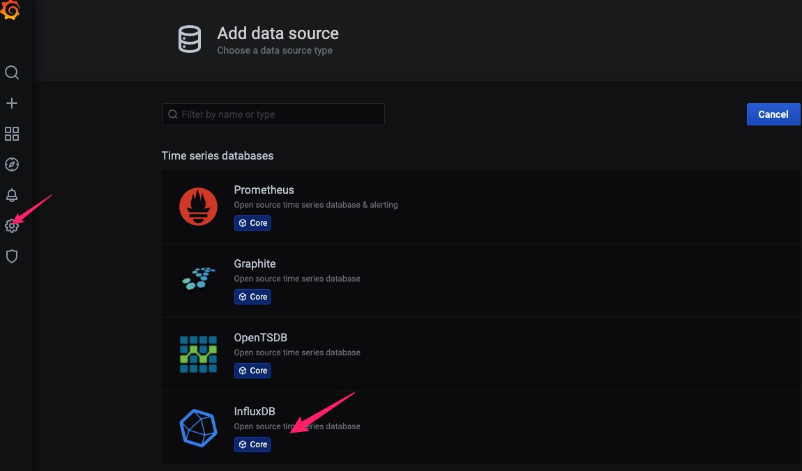 安装InfluxDB数据源,点击左侧的Configuration菜单,点击Data Sources,单击右则的Add data sources按钮,添加InfluxDB数据源。