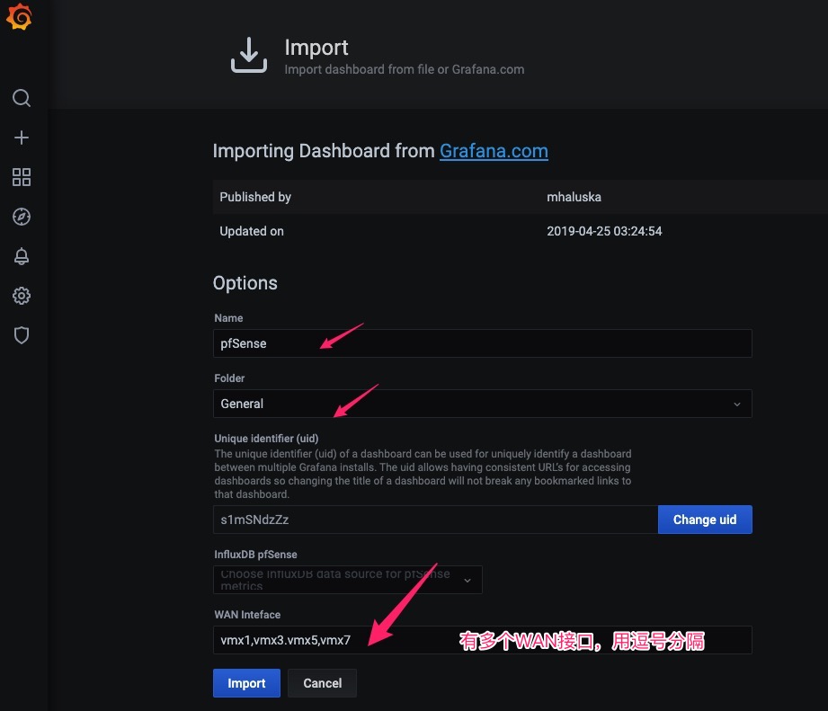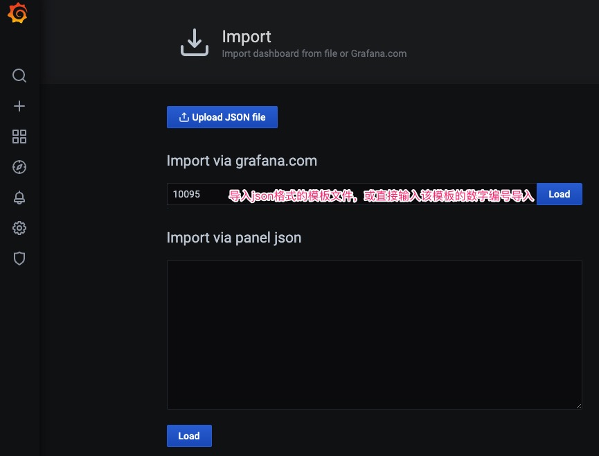 进入Grafana,点击左侧的”+”,选择import,导入模板文件,可以在这里下载适合pfSense的Grafana仪表板文件,也可以直接输入该模板的数字编号10095导入。