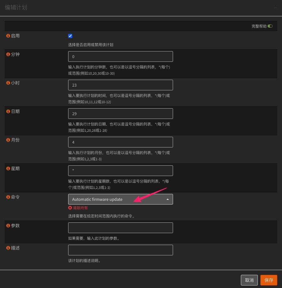 导航到系统>cron(计划),添加一个cron,编辑计划执行的相关时间参数,命令选自动固件更新,如下图所示。
