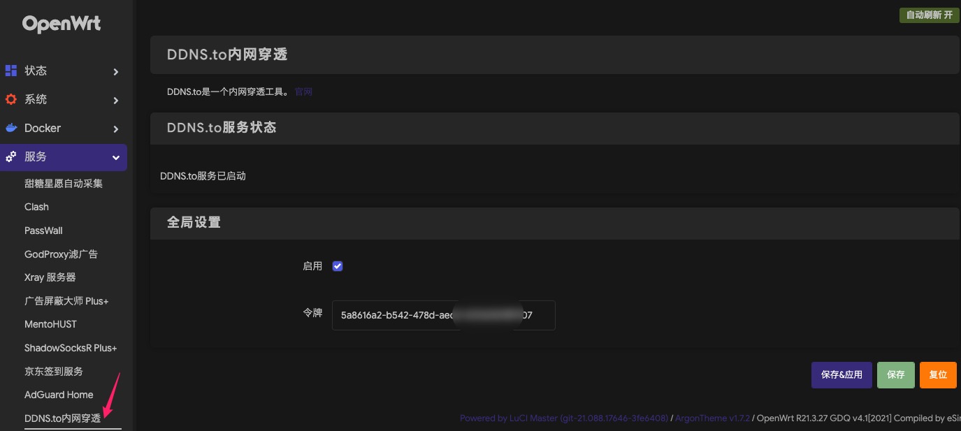 进入OpenWrt菜单项,导航到服务>DDNS.to内网穿透,打开DDNSTO配置页面,输入DDNSTO的令牌(使用微信注册获取),保存并应用。