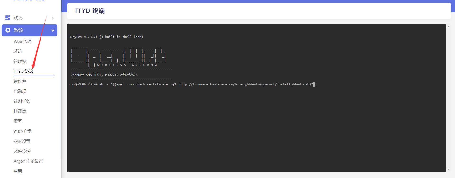 浏览器输入OpenWrt访问地址,进入系统>TTYD 终端菜单,输入以下任一命令安装: