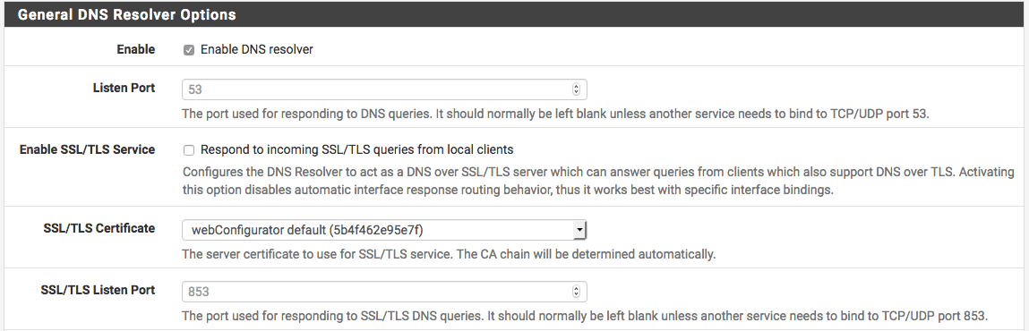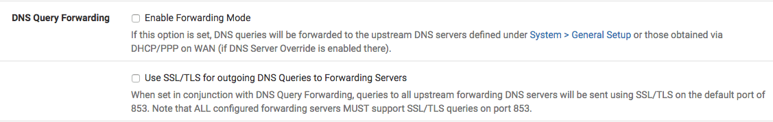 如果您通过pfSense博客文章阅读我们的DNS over TLS,可以通过在DNS解析器配置页面上的DNS 查询转发部分下启用这两个选项,以更简单的方式实现相同目的。此功能需要首先在系统>常规下定义的DNS over TLS功能的DNS服务器。