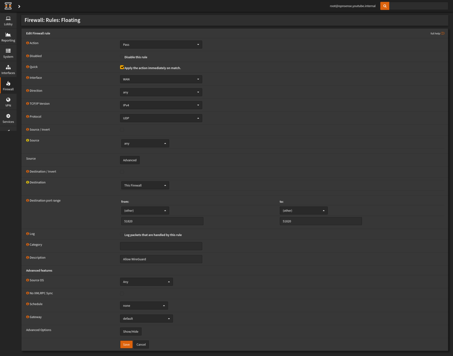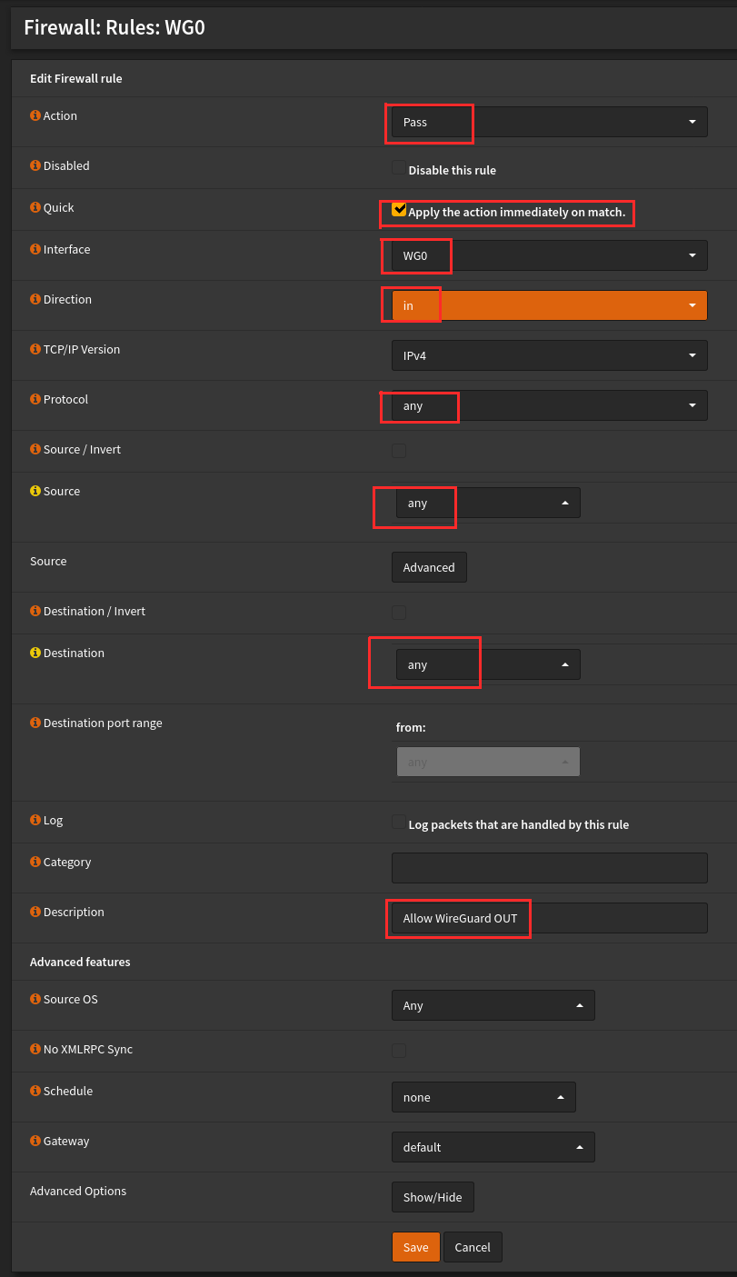 OPNSense WireGuard VPN服务器设置 发表于2021年4月24日由鐵血男兒 OPNSense上集成了WireGuard插件,除了可以配置为站点到站点的连接以外,也可以配置成服务器->客户端模式,方便我们使用手机等终端进行远程访问。 安装WireGuard 导航到System -> Firmware -> Plugins ->,安装os-wireguard插件。 启用服务 导航到VPN-> WireGuard,选中启用WireGuard。然后点击保存并应用更改。 添加本地服务器 导航到VPN -> WireGuard -> Local,点击添加,填写服务器各项参数并保存。 添加新端点 导航到VPN -> WireGuard -> Endpoints,点击添加,添加一个新端点。 配置手机端点 在android手机上添加新的对端。按“添加对端”后,将手机上的应用程序最小化,以便接收和复制服务器公钥。 交换公钥 导航到VPN -> WireGuard -> Local,点击编辑。然后复制公钥并将其发送给到手机。填写服务器地址、端口的信息,“允许的IP”指定为“0.0.0.0/0”。在OPNSense端,根据需要选择客户端(对等)或多个对等端,然后单击“保存”,在手机客户端上,单击“保存”图标。 注意:“允许的IP”会将路由表添加到你的客户端,如果要使用分割隧道类型的设置,请指定所有允许的内部CIDR,并以逗号分隔。 将配置保存在手机上后,返回服务器列表,点击服务器名称,然后在公共密钥区域中点击一次以便将密钥复制到剪贴板并将其发送到计算机。 在OPNSense上,转到VPN -> WireGuard -> Endpoints ,点击编辑。从手机中将公钥粘贴到“公钥”文本区域中,然后单击“保存”。 添加WAN接口防火墙规则 在WAN接口选项卡上添加防火墙规则,以允许WireGuard与防火墙进行通信。 导航到Firewall -> Rules -> Floating,点击添加,添加一条新规则: 动作:通过 接口:WAN 方向:任意 协议:UDP, 源:任意 目标:此防火墙 目标端口范围:51820 描述:允许WireGuard 其他:如果需要,请启用日志记录 测试连接 打开WireGuard应用并激活连接,并查看活动连接信息。 转到VPN -> WireGuard -> Handshakes,查看连接信息。 转到防火墙->规则->浮动,然后检查是否有流量进入。 添加WG接口 添加WG0接口 导航到Interfaces -> Assignments,选择WG0接口并点击右则”+”进行添加。 编辑接口 转到Interfaces -> Assignments -> OPT1启用接口。 选中防止接口被删除,输入描述信息,然后单击“保存”。 添加防火墙规则 在WG0接口上添加规则,以允许流量从WG0接口网络出站。 导航到Firewall -> Rules -> WG0,添加一条新规则。 动作:通过 接口:WG0 方向:输入 协议:任意 源:任意 目标:任意, 描述:允许WireGuard OUT 其他:如果需要,可以启用日志记录 保存并应用更改。 测试VPN连接 转到“ ifconfig.me”或“ dnsleaktest.com”进行测试,通过查看IP地址来确认是否采用了VPN连接。 相关文章: OPNsense WireGuard VPN站点到站点配置 安卓手机通过WireGuard VPN远程连接OPNSense防火墙 OPNsense WireGuard VPN配置 原文地址。