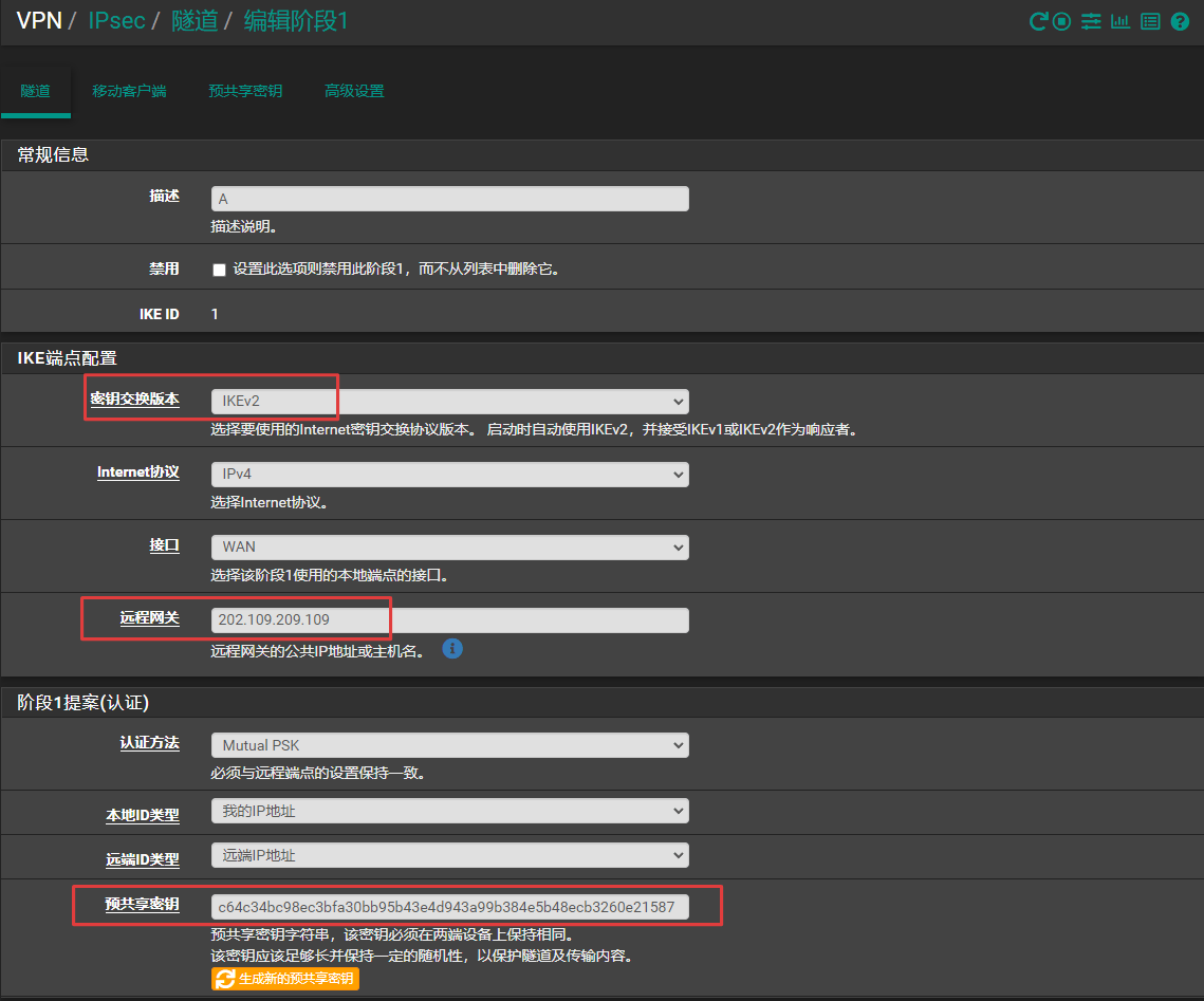 - 预共享密钥点下面的生成或手动输入,这里的密钥须与站点B相同。