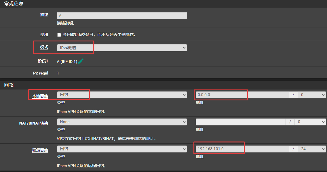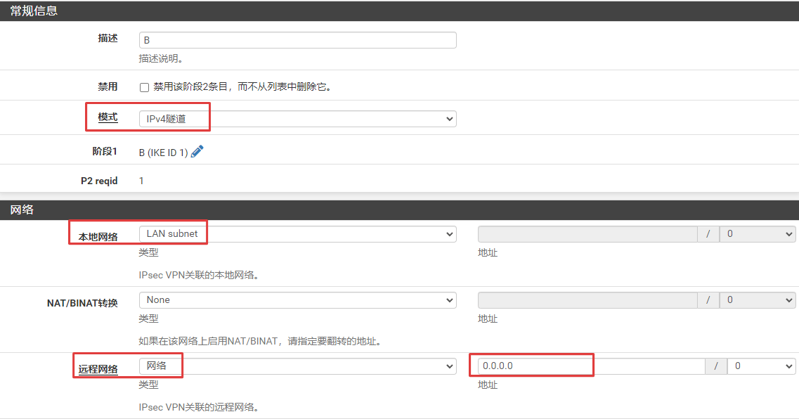 - 由于本指南要设置站点B的客户端通过站点A访问互联网,这里的本地网络须输入 0.0.0.0/0。如果没有这种需求,本地网络一般选LAN subnet。