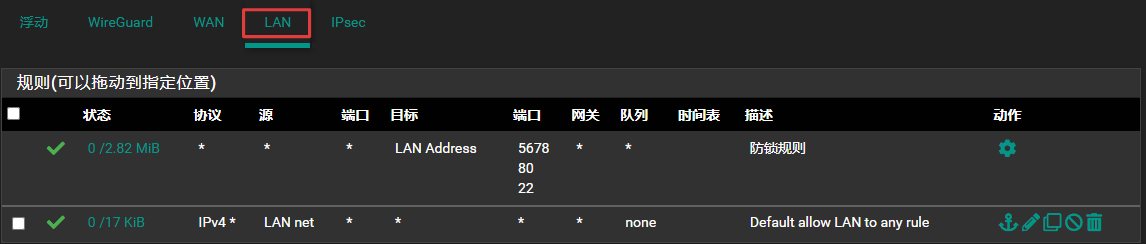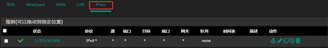 为保证VPN能正常通信,需要配置两条规则:一条规则允许从LAN到IPsecVPN 的流量;另一条允许从VPN到LAN的流量。