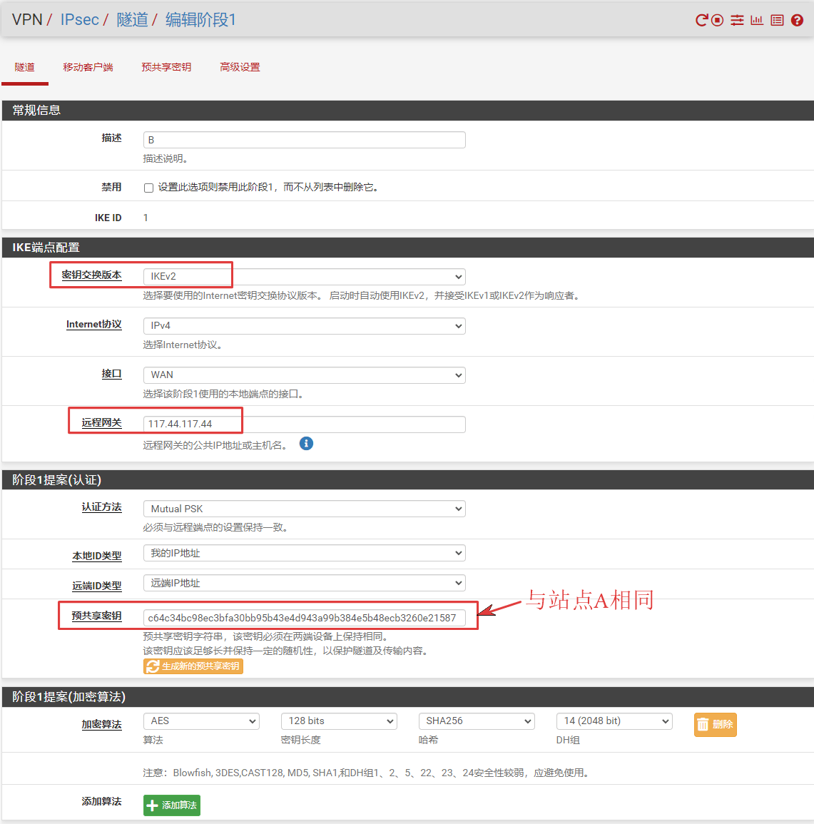 - 预共享密钥输入站点A中生成的密钥,两个站点必须相同。