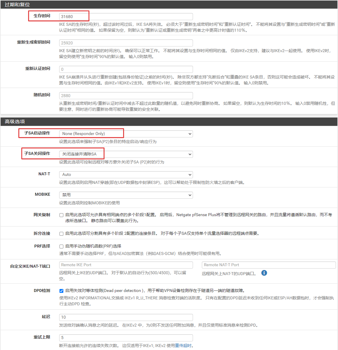 - 子SA 启动操作,选None(仅响应),让该端点不自行启动,而是由站点A来启动。