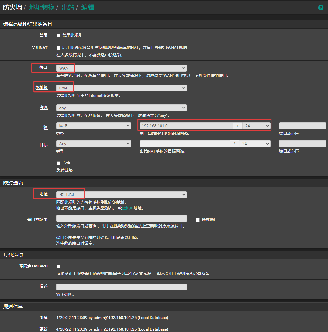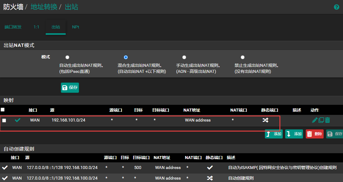 - 在列表顶部添加一条手动出站规则,允许站点B的LAN net网络通过站点A的WAN接口出站。接口选WAN,源输入站点B的LAN网络,地址选接口地址。
