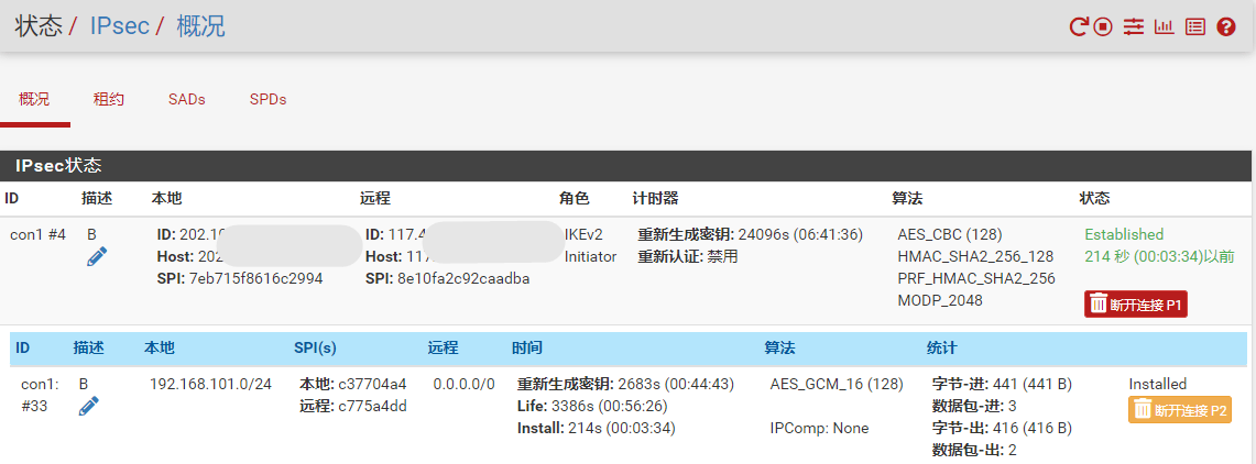 转到状态>IPsec,点击右侧的”连接P1和P2s”,应该就可以正常连接了。