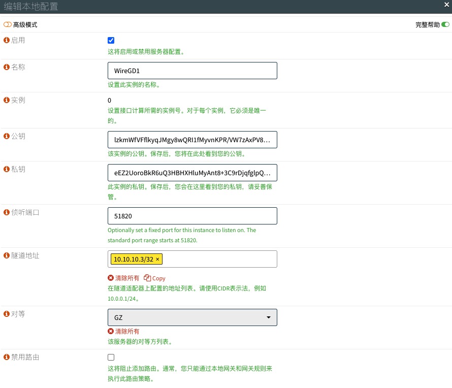在防火墙B上,导航到VPN>WireGuard>本地,单击下面的“+”添加本地隧道,接口公钥、私钥不用填写,保存后自动生成。这里的公钥与防火墙A的远程端点公钥必须一致。
