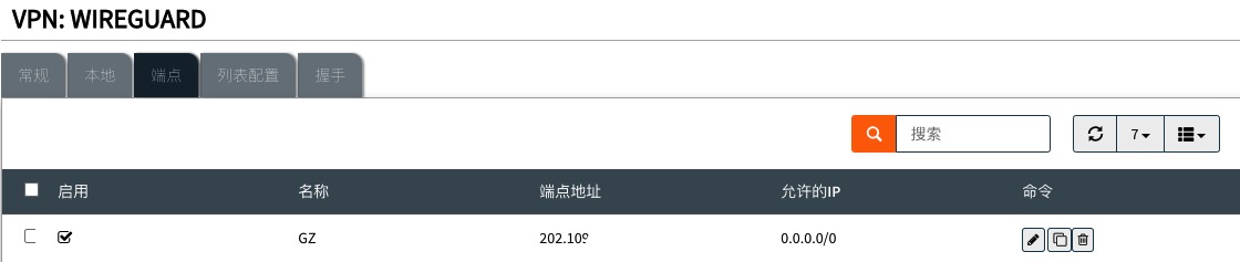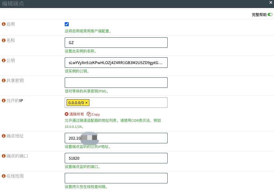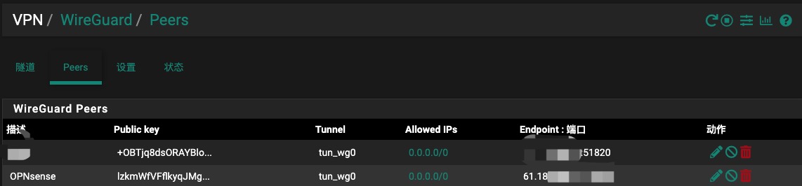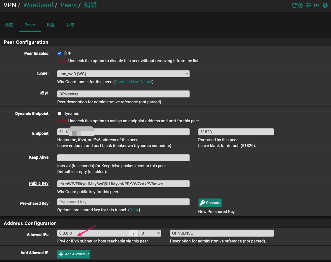 保存后,在页面下方单击添加对端,端点填写防火墙B的公网IP,端口填写后面步骤中防火墙B上设置的自定义端口或默认值,公钥可以先不填,待启用防火墙B的隧道后再复制过来。允许IP输入0.0.0.0/0,你也可以根据自己的子网和WG设置填写网络地址。