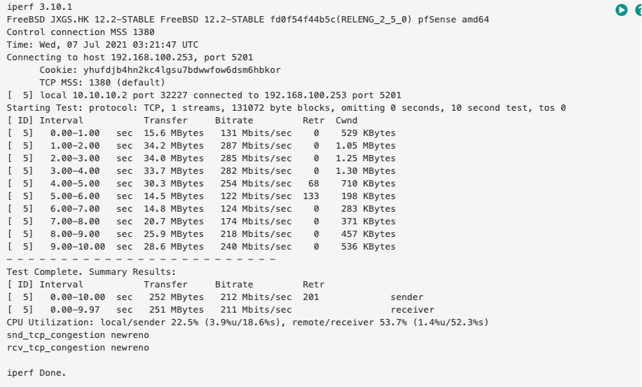 三、测速:用iperf3跑了一下测速,测试带宽为上、下行300M,测试结果如下图:
